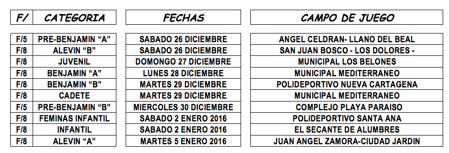 Los campos de San Juan Bosco y del Polígono Santa Ana acogerán partidos del X Trofeo de Navidad de fútbol base que organiza la Asociación de Clubes de Fútbol de Cartagena y Comarca.
