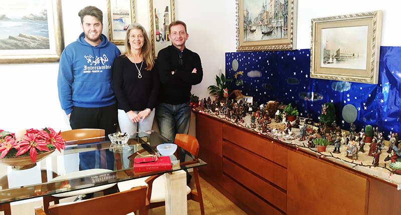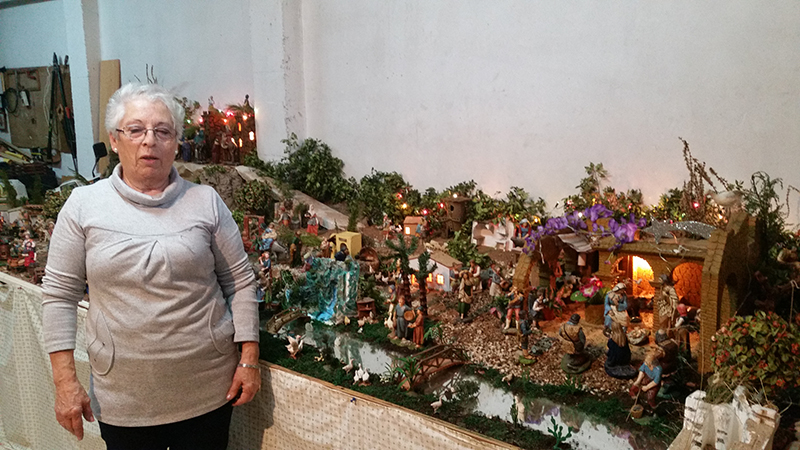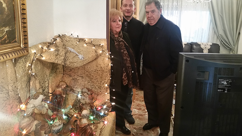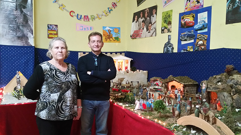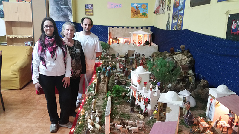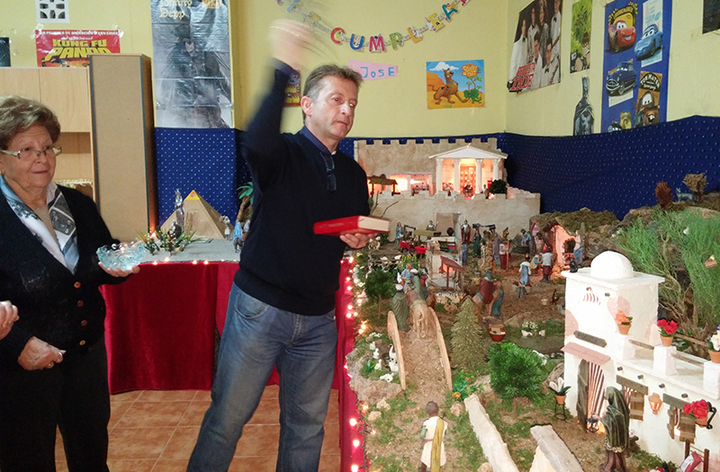 El sacerdote lleva a cabo la bendición del Belén que desde hace más de tres lustros montan José Manuel Parrón, María Rosario García y Nieves González Sánchez en la calle La Paz