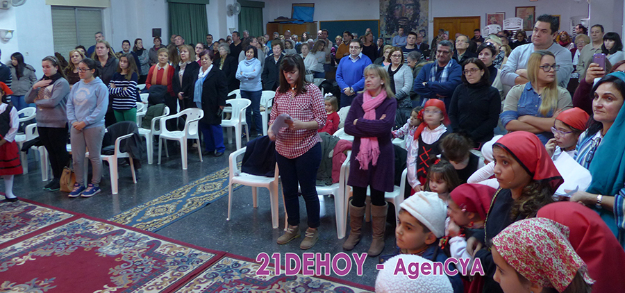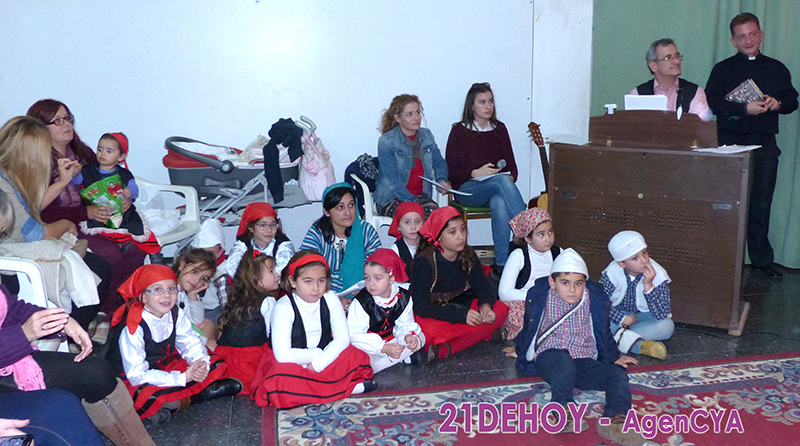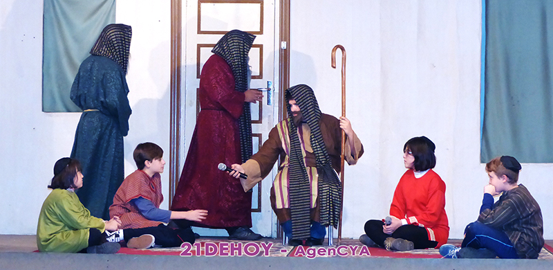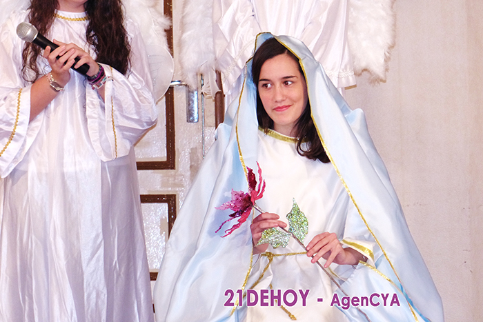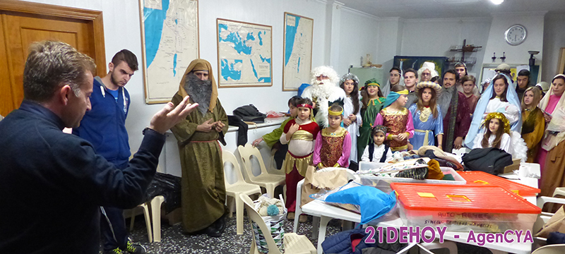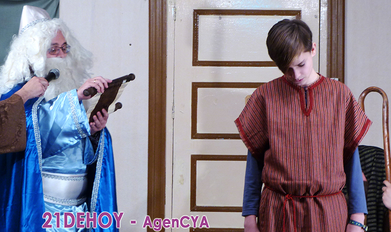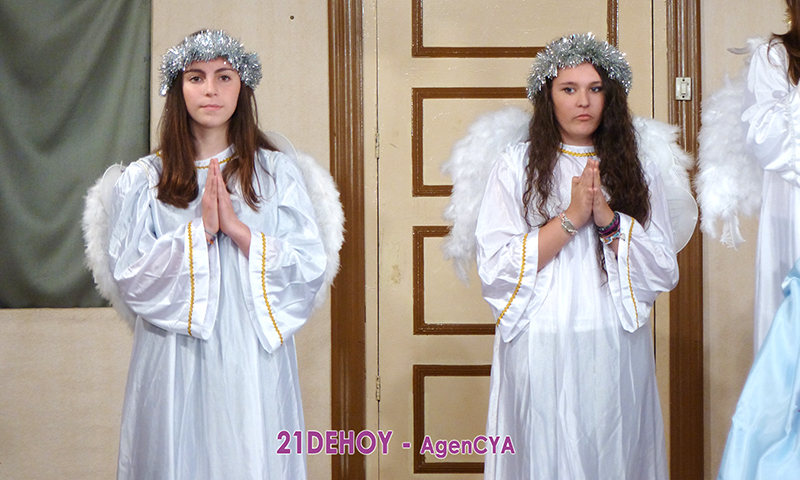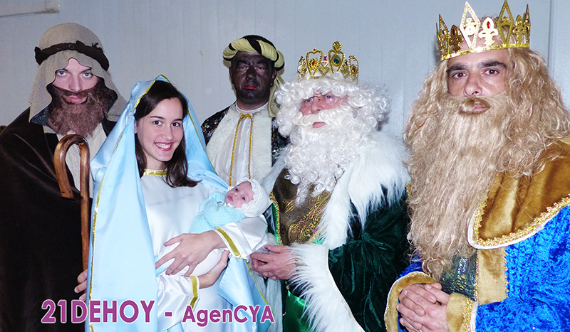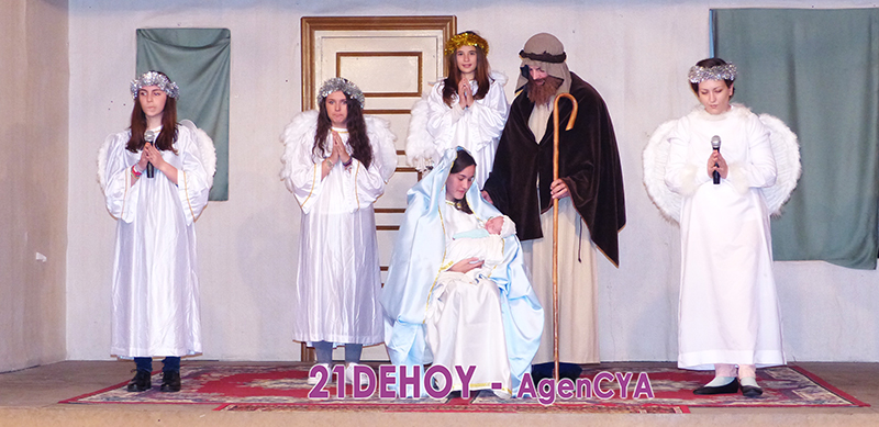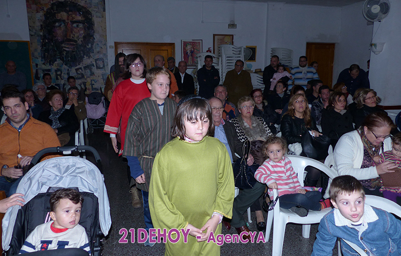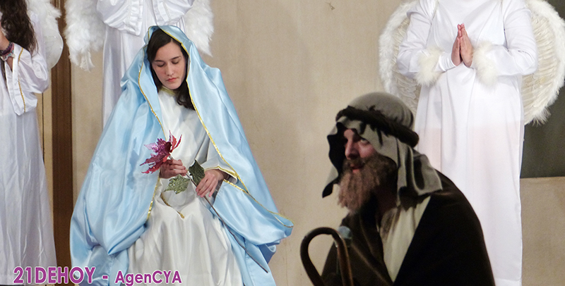 Más de treinta personas son las que, durante una hora, ponen en escena “esta catequesis viviente”, como la definió el coordinador del grupo, Pedro Rodríguez, en su alocución a los asistentes antes de comenzar la obra, explicando que no se trata “de una obra de teatro, es un auto sacramental que representa la historia”. El párroco, con una oración, le tomó el relevo antes del inicio de la representación, en la que José Antonio Huarte, durante muchos años director de la Coral Cartagonova, fue el encargado del capítulo musical. También llamó la atención la pequeña Eva, con apenas quince días de vida, y que fue la que encarnó al pequeño Jesús.