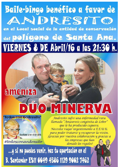 La velada para ayudar al niño dolorense que sufre una rara enfermedad en la mirada llamada ‘amaurosis congénita de Leber’ tendrá lugar el viernes 8 de abril a las 21.30 horas en el local social de la Entidad de Conservación del Polígono Santa Ana y será amenizada por la música de Dúo Minerva.