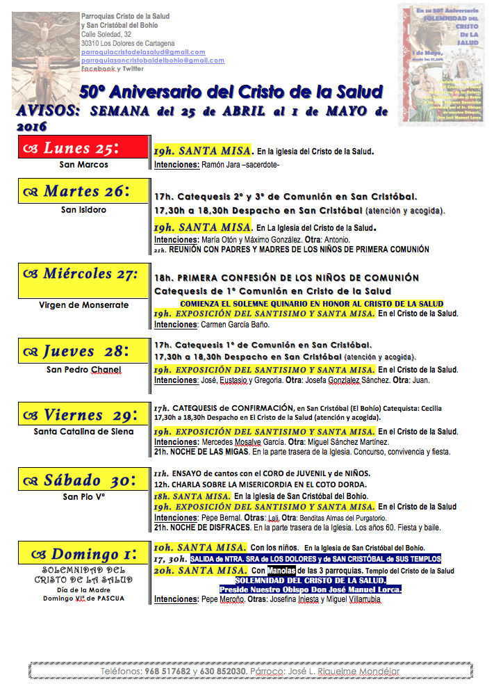 Avisos de la programación y actividad de las parroquias del Cristo de la Salud de Los Dolores y de San Cristóbal, en la barriada del mismo nombre, para esta semana del 25 de abril al uno de mayo de 2016.