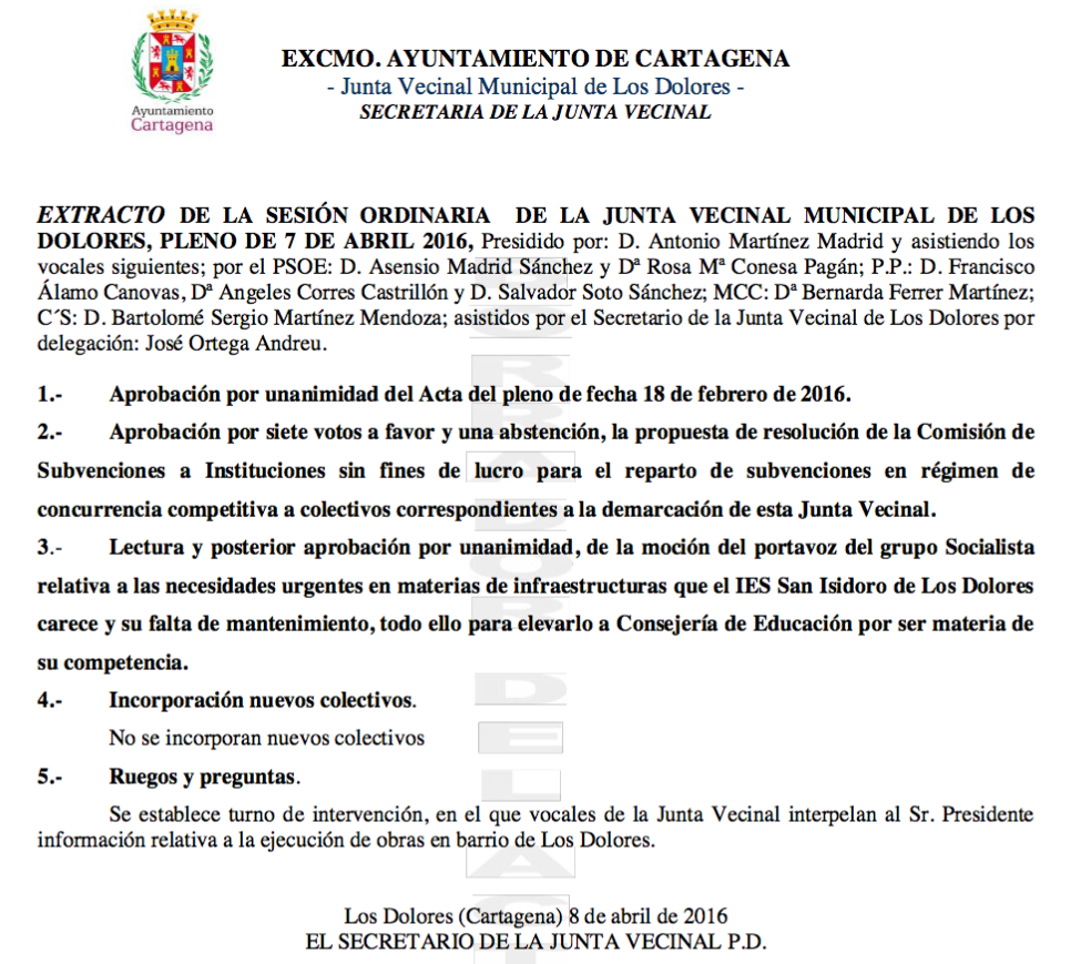 El acta del pleno de la Junta Vecinal de Los Dolores