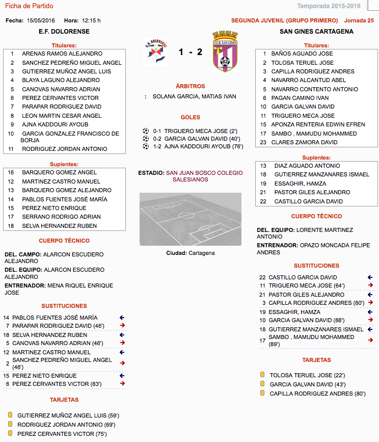 El equipo de segunda juvenil no pudo con el San Ginés (1-2) en el partido que dilucidaría el tercer puesto en la clasificación. Fue la única derrota de los equipos federados de la Escuela de Fútbol del Club Deportivo Dolorense.
