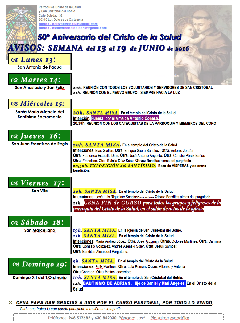 Avisos de la programación y actividad de las parroquias del Cristo de la Salud de Los Dolores y de San Cristóbal, en la barriada del mismo nombre, para esta semana del 13 al 19 de junio de 2016. Figuran el bautismo de Adrián y la cena de fin de curso para grupos y feligreseses.