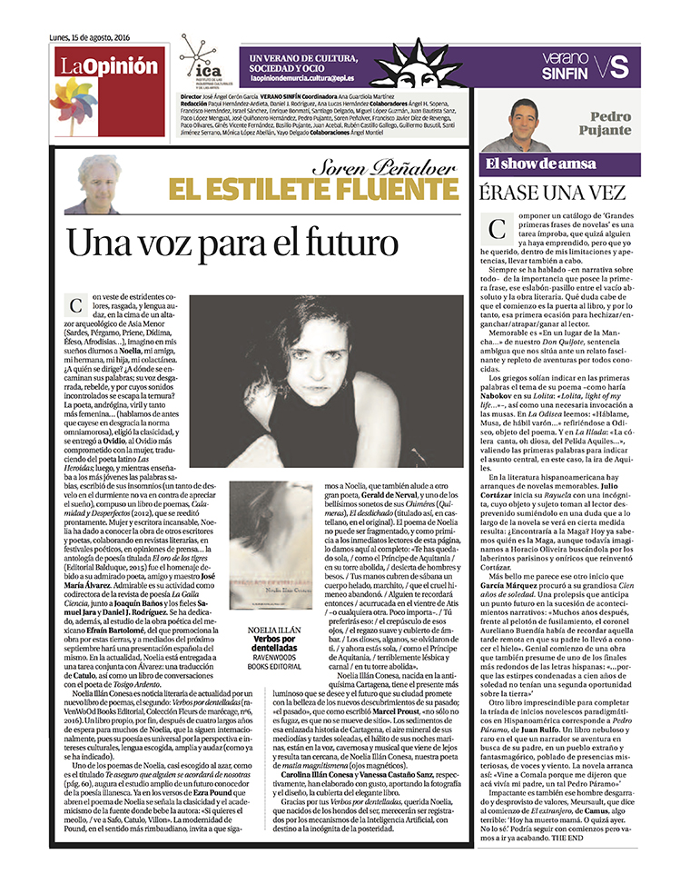 Es el título de la página que el poeta Soren Peñalver dedica en el diario La Opinión a la dolorense Noelia Illán Conesa en referencia a su trayectoria y a la publicación de su nuevo libro de poemas ’Verbos por dentelladas’. También desvela que la codirectora de la revista ’La Galla Ciencia’ está inmersa con el poeta cartagenero José María Álvarez en la traducción de ‘Catulo’ y en un libro de conversaciones con el poeta de ‘Tosigo Ardento’.
