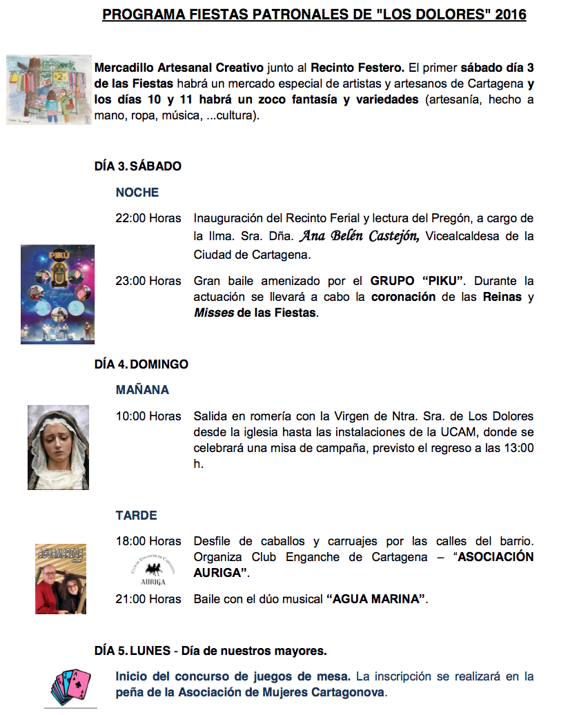 El recinto ferial ubicado junto al puente de Los Barreros será el epicentro de la primera jornada con la instalación de un mercadillo artesanal, el pregón de la vicealcaldesa de Cartagena (Ana Belén Castejón) y la corona de reinas y mises, mientras que el domingo destacan la romería con destino al campus universitario de la UCAM y el desfile de carruajes de la tarde.