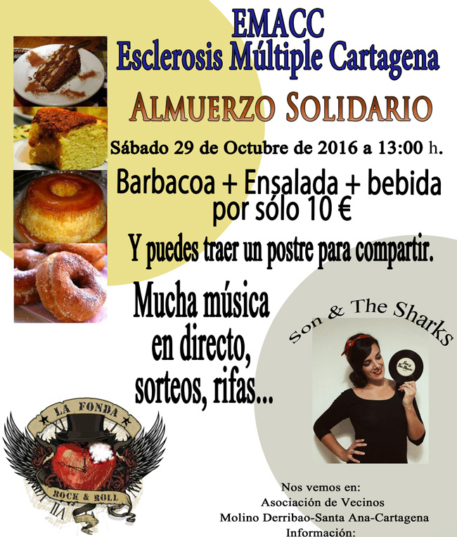 La asociación de Cartagena y comarca por la esclerosis múltiple ha organizado para este sábado un almuerzo solidario para recaudar fondos. Será en la Asociación de Vecinos de Molino Derribao.