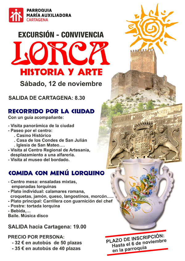 La Parroquia de María Auxiliadora ha organizado una excursión de convivencia para el próximo sábado 12 de noviembre a fin de conocer el patrimonio de Lorca. El plazo de inscripción está abierto hasta el 6 de noviembre.