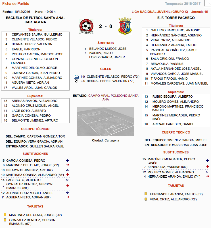 El conjunto de la Liga Nacional Juvenil, que venía de sufrir dos derrotas, consigue una victoria de prestigio al derrotar al EF Torre-Pacheco, uno de los ‘gallitos’ del grupo. Pedro Clemente, de penalti, y Valentín Bernal, con sus goles en apenas cuatro minutos (minutos 73 y 77, respectivamente) decidieron el partido disputado en las instalaciones del Polígono Santa Ana.