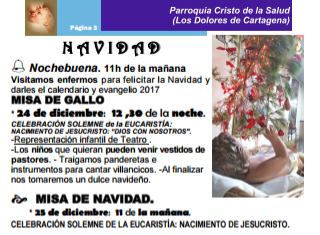 La parroquia del Cristo de la Salud organiza la tradicional Misa del Gallo este sábado a las 12.30 horas de la noche. Además por la mañana a las 11 horas tendrá lugar una visita a los enfermos.