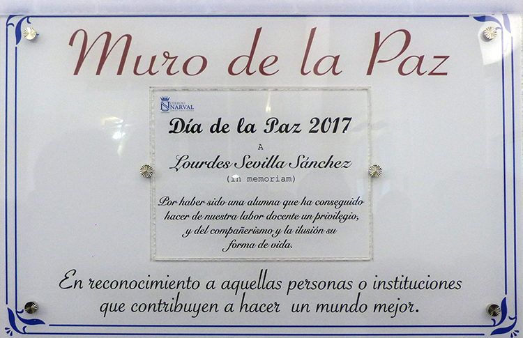 de Gandhi y que este año el centro ha decidido habilitar un espacio en el interior de sus instalaciones denominado ‘Mural de la paz’, donde figurará el nombre de personas que han sido especiales. La puesta de largo de este lugar tan especial lleva el nombre de Lourdes Sevilla Sánchez, quien fue alumna del centro, y que mostró valores como “generosidad, sacrificio, ternura, esperanza, sensibilidad, etc.”, expuso Mercedes Sánchez. “Lourdes no sólo ha recalado en nuestra memoria, sino que ha quedado aferrada a nuestros corazones”.