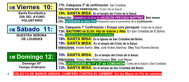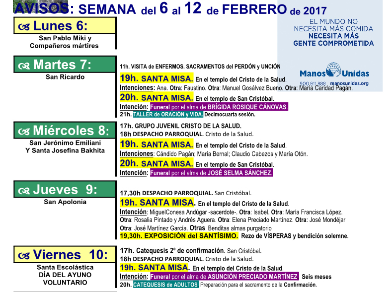 Avisos de la programación y actividad de las parroquias del Cristo de la Salud de Los Dolores y de San Cristóbal, en la barriada del mismo nombre, para la semana del 6 al 12 de febrero.