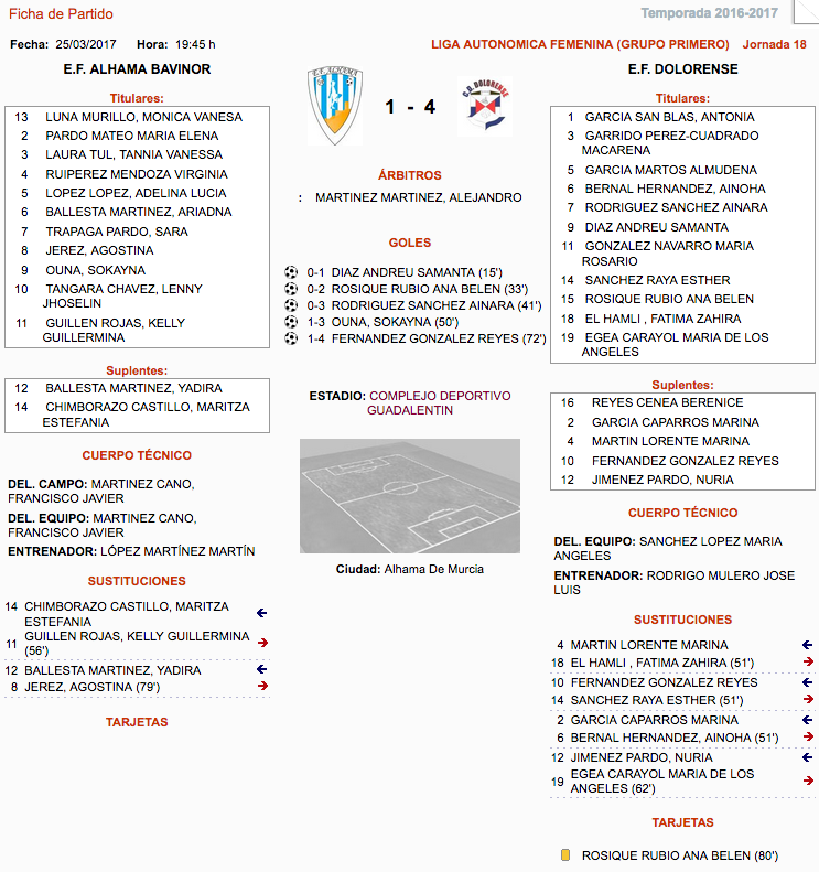 Cierra la liga regular con un claro triunfo en Alhama que supone la cuarta victoria consecutiva y asegurar la segunda plaza en la Liga Autonómica de fútbol femenino. Samanta, Ana, Ainara y Reyes, goleadoras.