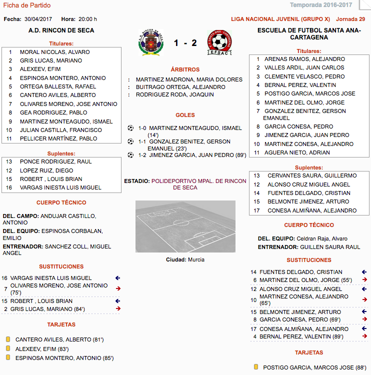 Un gol de Juan Pedro Jiménez en el minuto 89 consuma la remontada de la Escuela de Fútbol Santa Ana en el campo de la AD Rincón de Seca y aleja al equipo en seis puntos de los puestos de descenso de la Liga Nacional de fútbol júvenil.