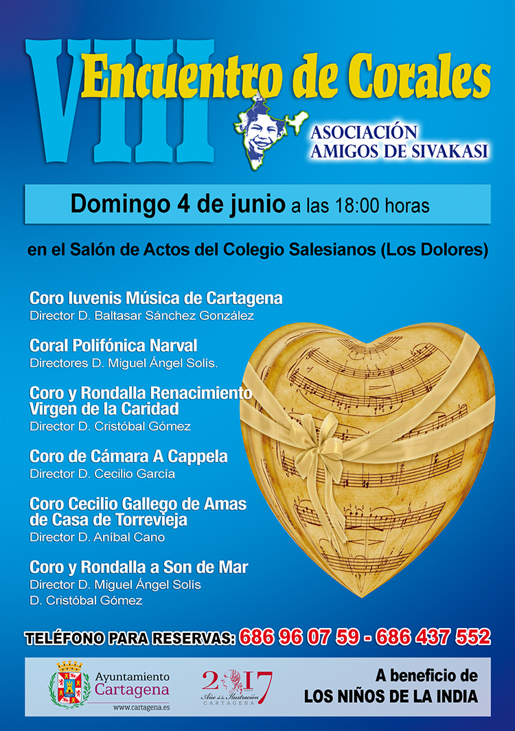 La octava edición de Encuentro de corales que organiza la Asociación Amigos de Sivakasi tendrá lugar el próximo 4 de junio en el salón de actos del colegio Salesianos y su recaudación tendrá como destino ayudare a los niños de dicha población de la India.