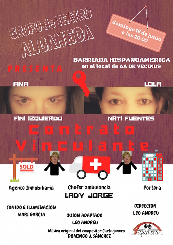 El próximo domingo 18 de junio, a las 20.00 horas, el local de la asociación de vecinos de la barriada Hispanoamérica acogerá la obra de teatro ‘Contrato vinculante’, representada por el grupo de teatro Algameca, bajo la dirección de Leo Andreu.