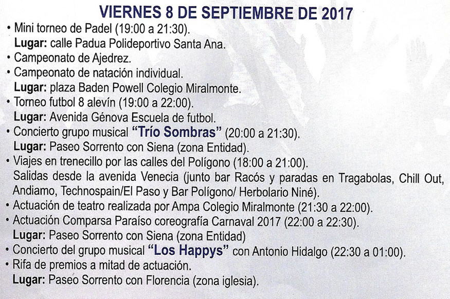 un cañón de confeti, junto a la escuela de danza, banda de música y, entre otros, las incansables chicas que dirige Lola Chacón trasladaron a la vía pública su espectáculo marino en el que los colores expresan el bien y el mal, con presencia de un maligno pulpo. El desfile gustó, pero en el lado del debe tuvo algunos cortes de excesiva duración, algo que, sin duda, se mejorará en próximas ediciones. Después el epicentro se situó en el cruce de paseo Sorrento con Siena. Por el escenario, con Gaspar Zamora como presentador, pasaron la pregonera y los distinguidos de la noche, de los que ofrecemos artículos individuales. Cerró la música de Kar-P-Diem, grupo formado por residentes en el Polígono. Las autoridades presentes fueron, además de la alcadesa, Ana Belén Castejón, estuvieron los concejales Juan Pedro Torralba, Francisco Calderón y David Martínez. También estuvo Pilar Marcos, edil de CTSSP, pero en su rol de integrante de la comisión organizadora de estas fiestas.