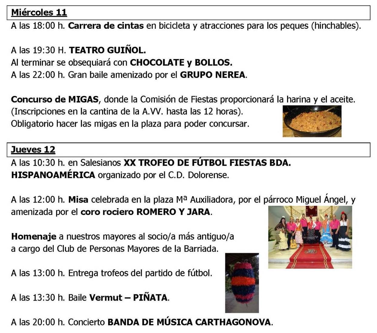 Esta noche es para disfrutar de las migas en buena compañía y con la música de grupo Nerea. Antes, carrera de cintas en bicicleta y teatro guiñol con chocolate y bollos. El jueves es para el campeonato de fútbol, la misa rociera y el baile del vermú en jornada matinal y el concierto de la Unidad Musical Cartagonova por la tarde-noche.