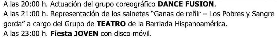 El grupo coreográfico 'Dance Fusión' activa este día a partir de las ocho de la tarde. Después, el humor por la vía del teatro y la noche joven con disco-móvil.