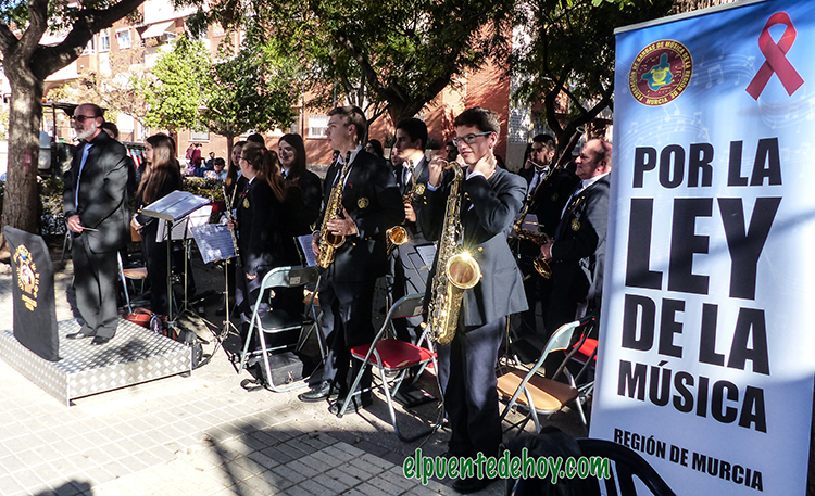 Junto a los músicos ha lucido la pancarta que las diferentes bandas de música de la Región llevan desde hace semanas para reclamar la puesta en marcha de una Ley de la Música en la comunidad autónoma, siendo vital para el futuro de la gran mayoría de grupos.