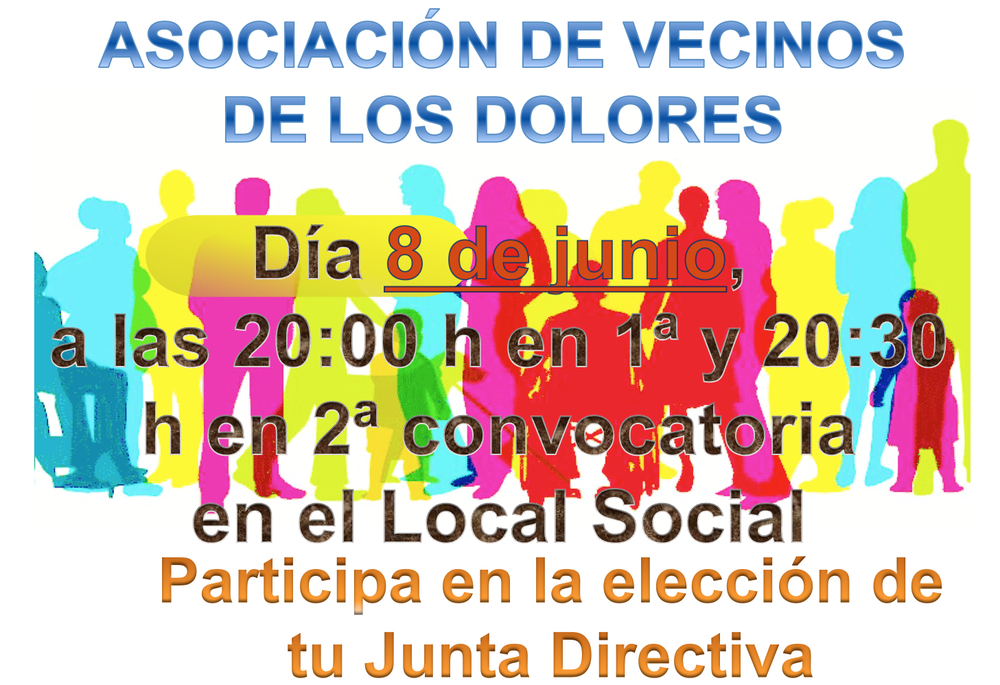La Asociación de Vecinos de Los Dolores celebra hoy, a partir de las 20 horas, la segunda oportunidad para elegir junta directiva tras el fallido intento de hace unos meses. El riesgo es que no haya candidatos, lo que llevaría al colectivo a su desaparición. Al parecer, hay algún grupo de vecinos que ultima su presentación. Lo que sí se aboga es por la presencia de los socios a esta asambela general ante la delicada situación.