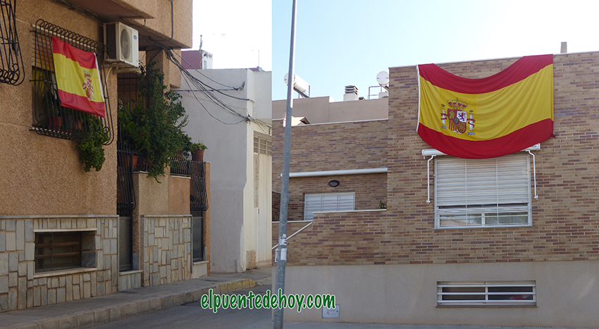 El conflicto catalán, desatado a raíz del referéndum antoconstitucional de independencia de Cataluña, ha propiciado una reacción popular de apoyo a la unidad de España, que se ha plasmado en manifestación y en colocar la bandera de la nación en sitios visibles. Valgan estos ejemplos en Los Dolores, en los que se observa la enseña con el escudo del estado español.