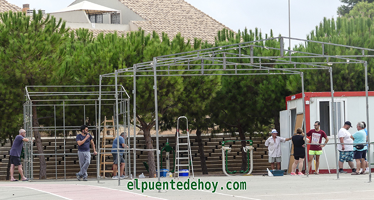 Este pasado fin de semana han comenzado los trabajos de montaje de casetas, escenario y otras instalaciones del recinto de las fiestas de Los Dolores, que comienzan este próximo sábado, junto al puente de Los Barreros.