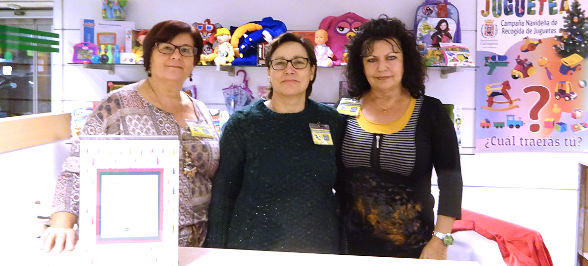 Integrantes de la Asociación de Mujeres Cartagonova en el centro comercial de la Alameda de San Antón recogiendo juguetes.