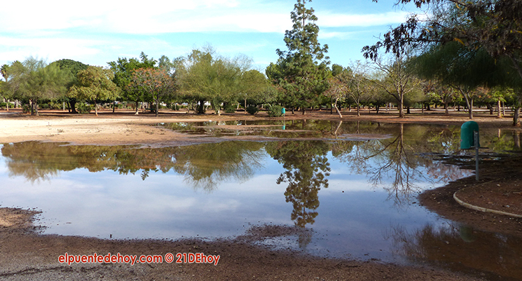 Así ha amanecido esta mañana el parque de los Exploradores de la Región de Murcia del complejo residencial del Polígono Santa Ana tras la lluvia caída ayer.