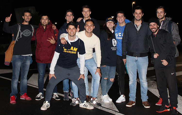 Grupo de alumnos del campus de la UCAM Cartagena en Los Dolores que esta noche se desplazan a Murcia para ver el partido europeo de baloncesto entre el UCAM CB Murcia y el Bayern de Munich.
