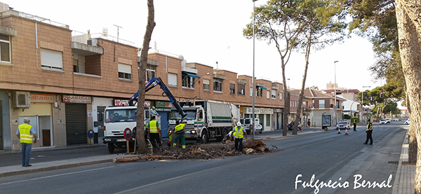 Escena de poda de árboles en la antigua N-301, a la altura de la barriada de San Cristóbal.