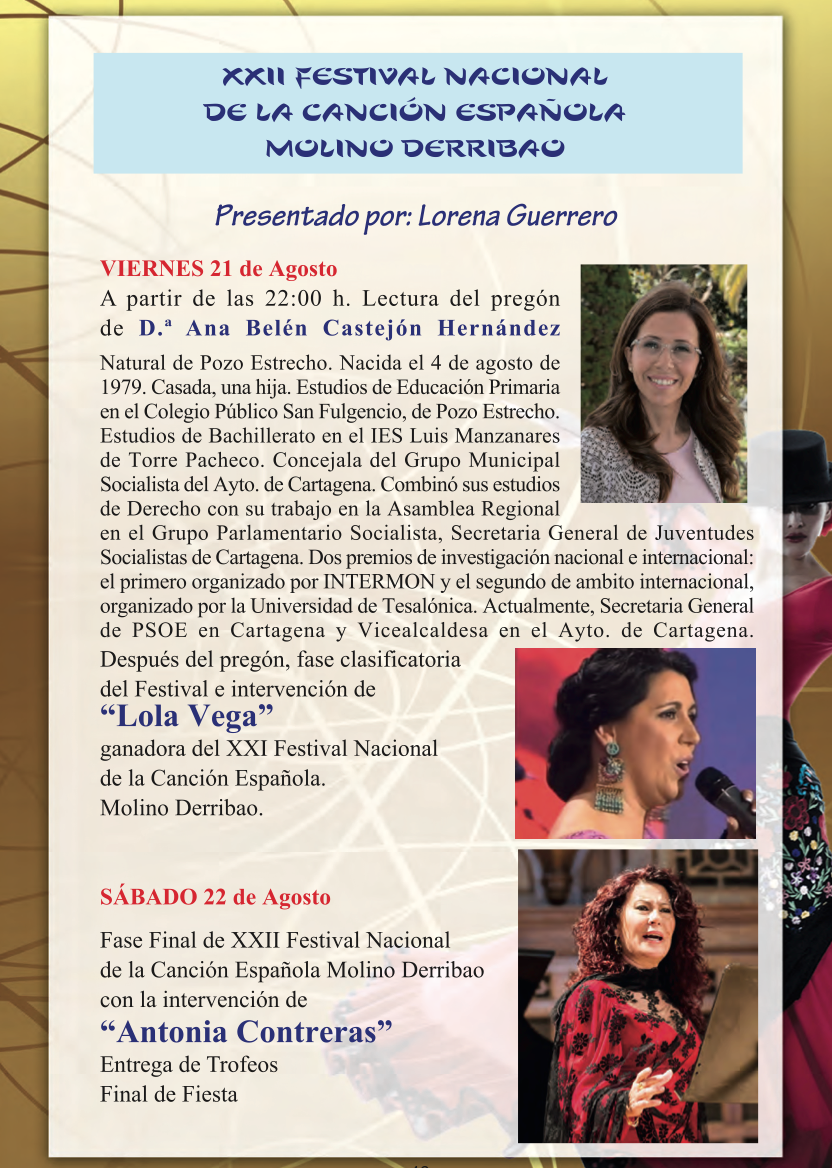 El festival volverá a tener como presentadora a Lorena Guerrero, comenzando el 21 de agosto a las 22 horas con el pregón de la vicealcaldesa de Cartagena, Ana Belén Castejón. Ese día se celebrará la fase de clasificación y actuará Lola Vega, ganadora de la edición anterior. El sábado 22 de agosto se disputará la final y la actuación estelar será de Antonia Contreras.
