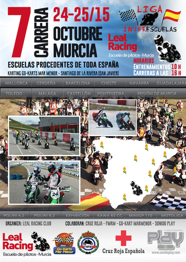 El circuito Karting Go Mar Menor, situado próximo al aeropuerto de San Javier, será el escenario de la séptima prueba de la Liga Interescuelas de este año, que tiene previsto contar con la presencia de un centenar de nuevos pilotos procedentes de Mallorca, Málaga, Castellón, Valencia, Guadalajara, Toledo, Barcelona, Pontevedra y Región de Murcia, además de Portugal e Italia. Entre las personas que acudirán está Chicho Lorenzo, quien dirige la red de escuelas Lorenzo Competición, en la que los nuevos pilotos se preparan con el mismo formato que llevó a Jorge Lorenzo a la gloria mundialista del motociclismo.