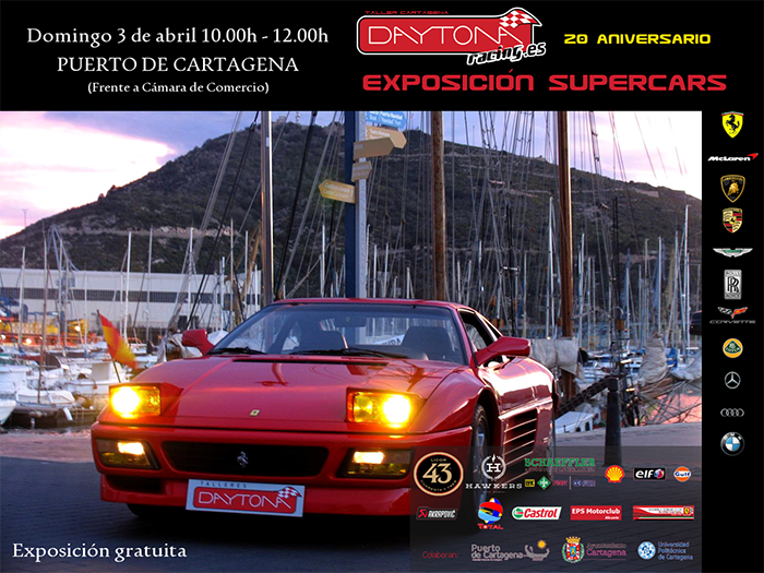 Ferrari, Porsche, Lamborghini o Maserati serán algunas de las marcas de coche que se podrán disfrutar en la exhibición de vehículos de alta gama que se celebra este domingo, 3 de abril, en el puerto de Cartagena, con motivo del veinte aniversario de la empresa dolorense Talleres Daytona.