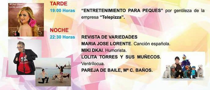Es la noche de la revista de variedades con la cantante María José Lorente, el humor de Miki Dkai, Lolita Torres y sus muñecos y la pareja de baile de Mari Carmen Baños.