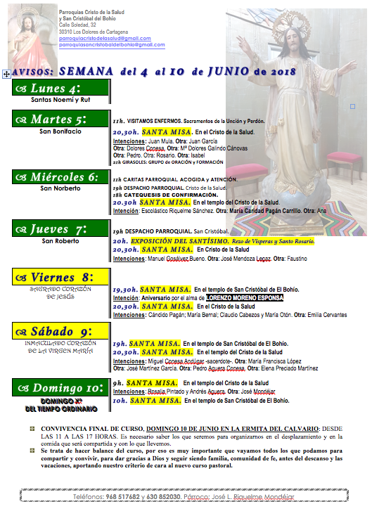 Avisos de la programación y actividad de las parroquias del Cristo de la Salud de Los Dolores y de San Cristóbal, en la barriada del mismo nombre, para la semana del 4 al 10 de junio de 2018. El próximo domingo se celebrará, como final de curso, una convivencia en la ermita del Calvario.