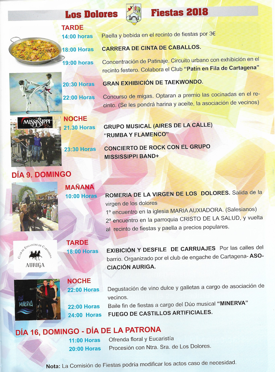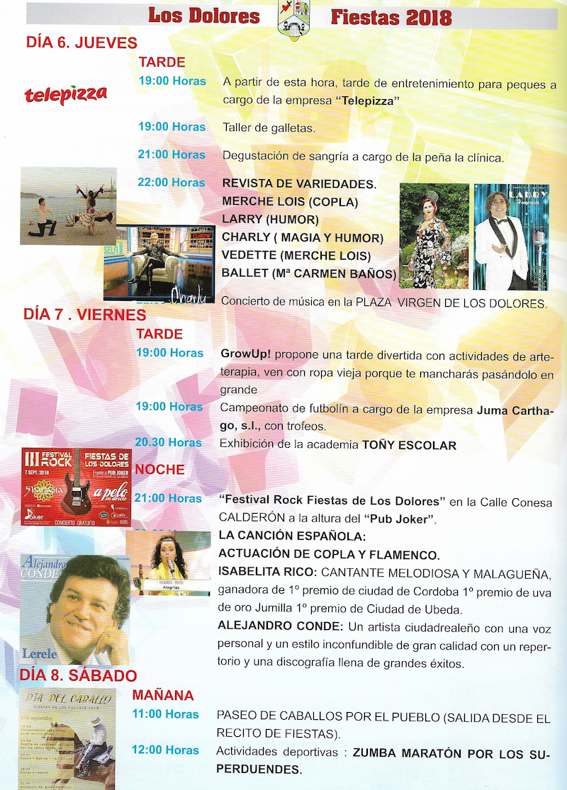 Jueves de noche de variedades en el recinto ferial y concierto en la plaza Virgen de los Dolores, viernes con el gran festival de rock frente a Pub Jóker y actuación de Alejandro Conde en el recinto festero, sábado de caballos y taekwondo y domingo de romería con cierre a cargo del dúo Minerva.