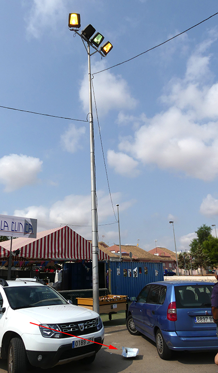 Forma parte de una de las dos farolas que lleva tres días apagadas y que estaba siendo reparada esta mañana. Ha caído sobre un turismo, al que apenas ha producido daños, pero el comentario es que si llegar “a ocurrir de noche, cuando se están celebrando las fiestas…”