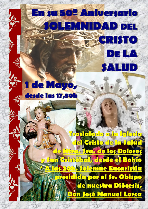Para conmemorar el 50 aniversario de la Parroquia Cristo de la Salud de Los Dolores, el próximo domingo 1 de mayo se realizará una procesión del traslado hasta la misma de las imágenes de Nuestra Señora de los Dolores y de San Cristobal, que se encontrarán con el titular de la iglesia anfitriona. El acto se iniciará a las 17.00 horas desde la Parroquia Nuestra Señora de los Dolores en el caso de la virgen y de la Parroquia de El Bohío para San Cristobal.