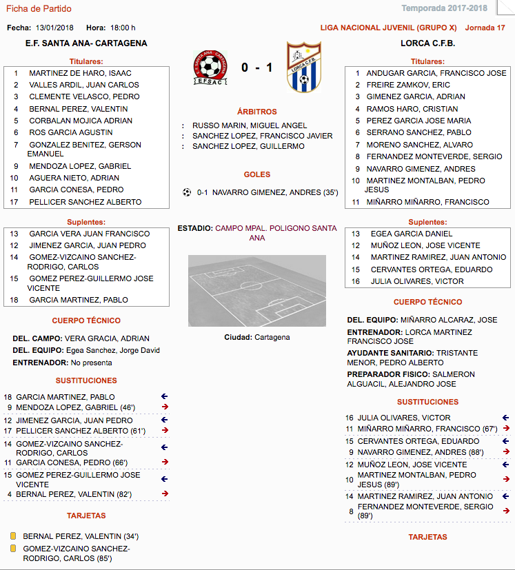 La Escuela de Fútbol Santa Ana no puede con el Lorca CF, que se lleva los tres puntos con un gol en el minuto 35 en partido de la Liga Nacional Juvenil.