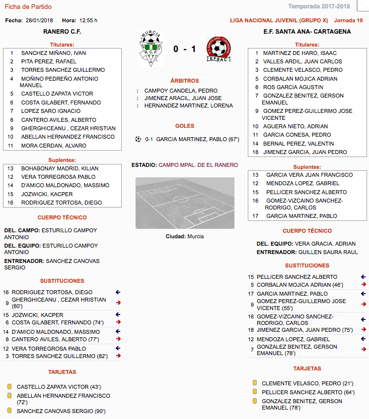 Un gol de Pablo García en la segunda mitad derrota al Ranero en Murcia y da la segunda victoria consecutiva a la Escuela de Fútbol Santa Ana en la Liga Nacional Juvenil, donde vuelve a acercarse a la zona alta.