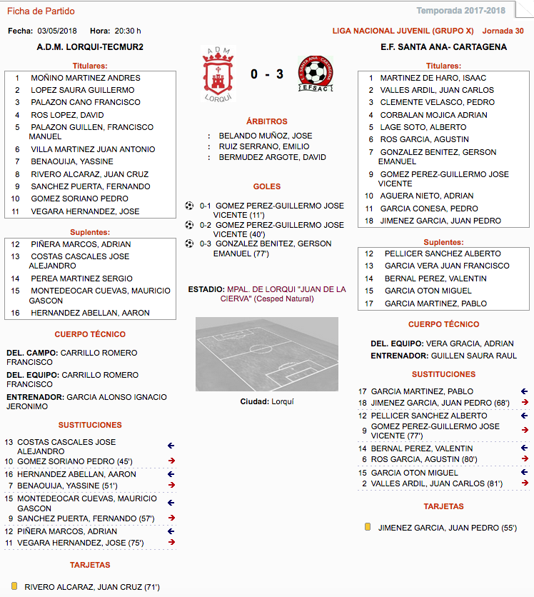 La Escuela de Fútbol Santa Ana gana con autoridad en el campo de la ADM Lorquí con tres goles de José Vicente Gómez.
