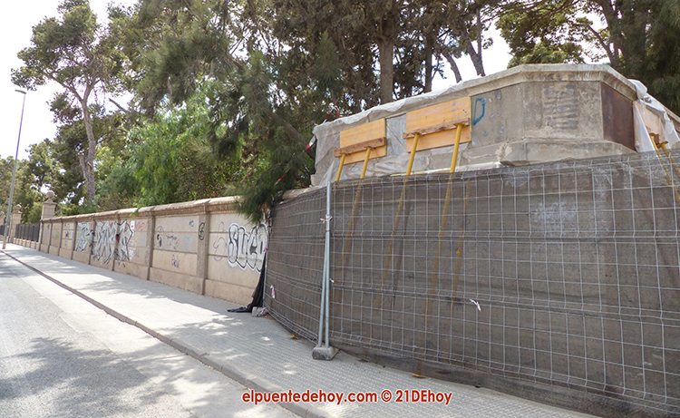 Imagen de una de las esquinas del recinto del Huerto de las Bolas-Casa Beltrí apuntalada para evitar su caída.