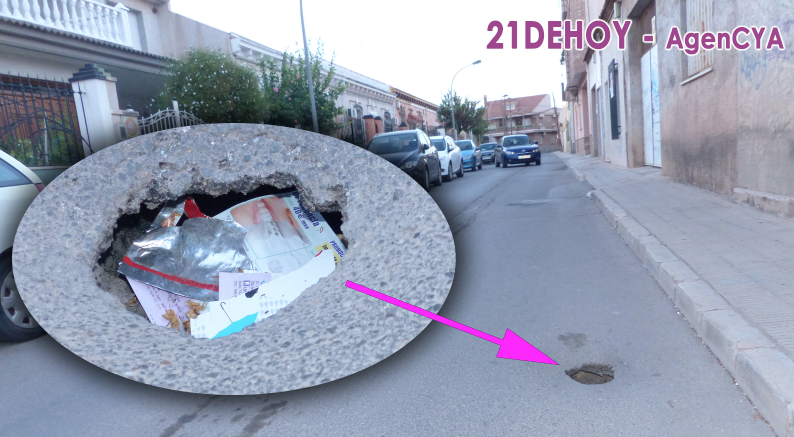 Vecinos de la calle Martínez Navarro denuncian este agujero que se ha formado en el asfalto de la calle y que resulta de gran peligro, no sólo para los vehículos, sino para los viandantes, pues por su tamaño no es difícil introducir un pie y sufrir una grave lesión.