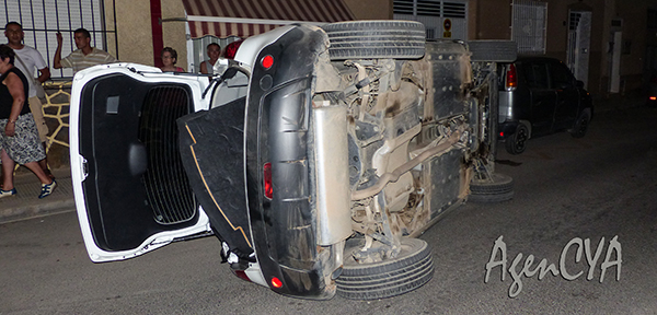 Sobre las diez de la noche de este miércoles, un “tremendísimo” golpe ha alterado la tranquilidad de los vecinos de la calle Martínez Navarro de Los Dolores, donde un turismo ha volcado tras colisionar con otro en un cruce, para después estrellarse contra otro coche que estaba aparcado, el cual ha desplazado varios metros. En principio, las heridas han sido leves.