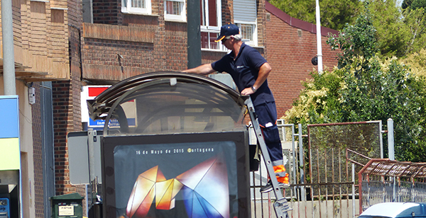 Limpiando las paradas del bus urbano en la Barriada de Hispanoamérica.