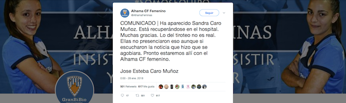 El equipo de Preferente Autonómica suspendió el partido frente al Alhama del pasado domingo en el campo San Juan Bosco debido a la desaparición de una futbolista alhameña, Sandra Caro, quien apareció posteriormente.